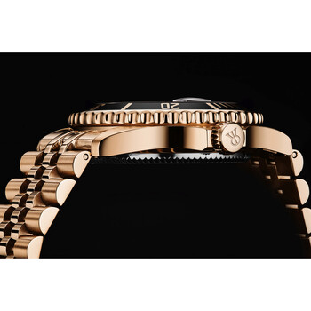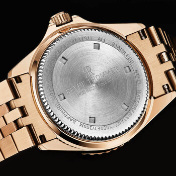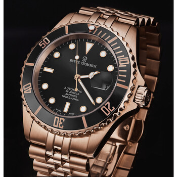 Rose gold-tone stainless steel case and bracelet. Uni-directional rotating black stainless steel bezel. Black dial with rose gold-tone hands and index hour markers. Minute markers around the outer rim. Dial Type: Analog. Luminescent hands and markers. Date display at the 3 o'clock position. Automatic movement. Scratch resistant sapphire crystal. Screw down crown. Solid case back. Round case shape, case size: 42 mm, case thickness: 12.65 mm. Band width: 22 mm, band length: 8 inches. Deployment with push button release clasp. Water resistant at 300 meters / 1000 feet. Functions: date, hour, minute, second. Diver Series. Dive watch style. Watch label: Swis Made. Revue Thommen Diver Automatic Black Dial Men's Watch 17571.2267.