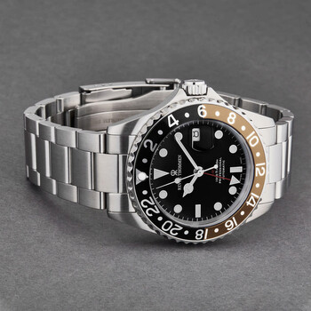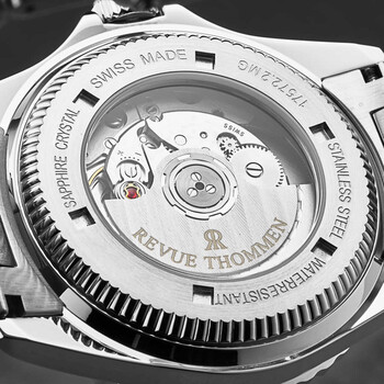 Silver-tone stainless steel case and bracelet. Bi-directional rotating beige stainless steel bezel. Black dial with silver-tone hands and index hour markers. Minute markers around the outer rim. Dial Type: Analog. Luminescent hands and markers. Date display at the 3 o'clock position. Sellita Caliber SW330-1 Automatic movement, containing 25 Jewels, bitting at 28800 vph, and has a power reserve of approximately 42 hours. Scratch resistant sapphire crystal. Screw down crown. Transparent case back. Round case shape, case size: 42 mm, case thickness: 13 mm. Band width: 22 mm, band length: 8 inches. Fold over clasp with a safety release. Water resistant at 300 meters / 1000 feet. Functions: date, GMT, second time zone, hour, minute, second. Additional Info: hours, minutes, sweep seconds with hack feature - quick-set date at 3:00 - independantly adjustable second timezone. Diver Series. Luxury watch style. Watch label: Swiss Made. Revue Thommen Diver Automatic Black Dial Men's Watch 17572.2132.