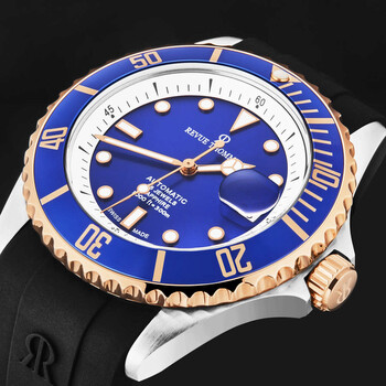 Silver-tone stainless steel case with a black rubber strap. Uni-directional rotating blue stainless steel bezel. Blue dial with gold-tone hands and index hour markers. Minute markers around the outer rim. Dial Type: Analog. Luminescent hands and markers. Date display at the 3 o'clock position. Sellita Caliber SW200 Automatic movement, containing 26 Jewels, bitting at 28800 vph, and has a power reserve of approximately 38 hours. Scratch resistant sapphire crystal. Screw down crown. Solid case back. Round case shape, case size: 42 mm, case thickness: 13 mm. Band width: 22 mm, band length: 8 inches. Fold over clasp with a safety release. Water resistant at 300 meters / 1000 feet. Functions: date, hour, minute, second. Additional Info: hours, minutes, seconds, date. Diver Series. Dive watch style. Watch label: Swiss Made. Revue Thommen Diver Automatic Blue Dial Men's Watch 17571.2355.
