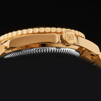 Rose gold-tone stainless steel case and bracelet. Uni-directional rotating green stainless steel bezel. Green dial with rose gold-tone hands and index hour markers. Minute markers around the outer rim. Dial Type: Analog. Luminescent hands and markers. Date display at the 3 o'clock position. Sellita Caliber SW200 Automatic movement, containing 26 Jewels, bitting at 28800 vph, and has a power reserve of approximately 38 hours. Scratch resistant sapphire crystal. Screw down crown. Solid case back. Round case shape, case size: 42 mm, case thickness: 12.65 mm. Band width: 22 mm, band length: 8 inches. Fold over clasp with a safety release. Water resistant at 300 meters / 1000 feet. Functions: date, hour, minute, second. Additional Info: hours, minutes, seconds, date. Diver Series. Dive watch style. Watch label: Swiss Made. Revue Thommen Diver Automatic Green Dial Men's Watch 17571.2464.