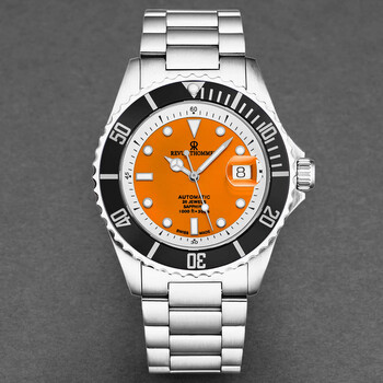 Silver-tone stainless steel case and bracelet. Uni-directional rotating black stainless steel bezel. Orange dial with silver-tone hands and index hour markers. Minute markers around the outer rim. Dial Type: Analog. Luminescent hands and markers. Date display at the 3 o'clock position. Sellita Caliber SW200 Automatic movement, containing 26 Jewels, bitting at 28800 vph, and has a power reserve of approximately 38 hours. Scratch resistant sapphire crystal. Screw down crown. Solid case back. Round case shape, case size: 42 mm, case thickness: 13 mm. Band width: 22 mm, band length: 8 inches. Deployment with push button release clasp. Water resistant at 300 meters / 1000 feet. Functions: date, hour, minute, second. Additional Info: hours, minutes, seconds, date. Diver Series. Dive watch style. Watch label: Swiss Made. Revue Thommen Diver Automatic Orange Dial Men's Watch 17571.2439.