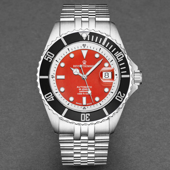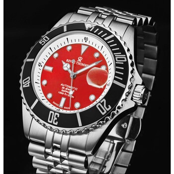 Silver-tone stainless steel case and bracelet. Uni-directional rotating black stainless steel bezel. Red dial with silver-tone hands and index hour markers. Minute markers around the outer rim. Dial Type: Analog. Luminescent hands and markers. Date display at the 3 o'clock position. Sellita Caliber SW200 Automatic movement, containing 26 Jewels, bitting at 28800 vph, and has a power reserve of approximately 38 hours. Scratch resistant sapphire crystal. Screw down crown. Solid case back. Round case shape, case size: 42 mm, case thickness: 13 mm. Band width: 22 mm, band length: 8 inches. Deployment with push button release clasp. Water resistant at 300 meters / 1000 feet. Functions: date, hour, minute, second. Additional Info: hours, minutes, seconds, date. Diver Series. Dive watch style. Watch label: Swiss Made. Revue Thommen Diver Automatic Red Dial Men's Watch 17571.2938.