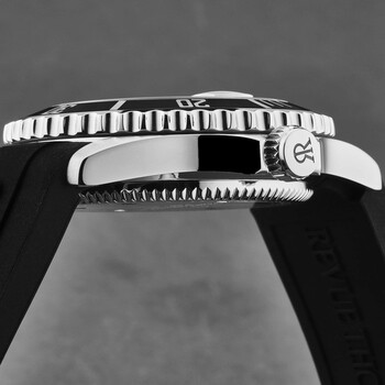 Silver-tone stainless steel case with a black rubber strap. Uni-directional rotating black stainless steel bezel. Red dial with silver-tone hands and index hour markers. Minute markers around the outer rim. Dial Type: Analog. Luminescent hands and markers. Date display at the 3 o'clock position. Sellita Caliber SW200 Automatic movement, containing 26 Jewels, bitting at 28800 vph, and has a power reserve of approximately 38 hours. Scratch resistant sapphire crystal. Screw down crown. Solid case back. Round case shape, case size: 42 mm, case thickness: 13 mm. Band width: 22 mm, band length: 8 inches. Deployment with push button release clasp. Water resistant at 300 meters / 1000 feet. Functions: date, hour, minute, second. Additional Info: hours, minutes, seconds, date. Diver Series. Dive watch style. Watch label: Swiss Made. Revue Thommen Diver Automatic Red Dial Men's Watch 17571.2338.