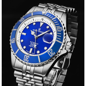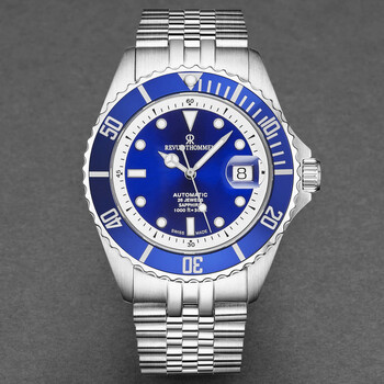 Silver-tone stainless steel case and bracelet. Uni-directional rotating blue stainless steel bezel. Blue dial with silver-tone hands and index hour markers. Minute markers around the outer rim. Dial Type: Analog. Luminescent hands and markers. Date display at the 3 o'clock position. Sellita Caliber SW200 Automatic movement, containing 26 Jewels, bitting at 28800 vph, and has a power reserve of approximately 38 hours. Scratch resistant sapphire crystal. Screw down crown. Solid case back. Round case shape, case size: 42 mm, case thickness: 13 mm. Band width: 22 mm, band length: 8 inches. Deployment with push button release clasp. Water resistant at 300 meters / 1000 feet. Functions: date, hour, minute, second. Additional Info: hours, minutes, seconds, date. Diver Series. Dive watch style. Watch label: Swiss Made. Revue Thommen Diver Blue Dial Men's Watch 17571.2928.