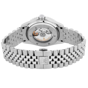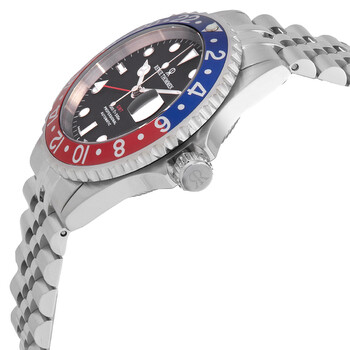 Silver-tone stainless steel case and bracelet. Bi-directional rotating multi-color stainless steel bezel. Black dial with silver-tone hands and index hour markers. Minute markers around the outer rim. Dial Type: Analog. Luminescent hands and markers. Date display at the 3 o'clock position. Sellita Caliber SW330-1 Automatic movement, containing 25 Jewels, bitting at 28800 vph, and has a power reserve of approximately 42 hours. Scratch resistant sapphire crystal. Screw down crown. Transparent case back. Round case shape, case size: 42 mm, case thickness: 12.65 mm. Band width: 22 mm, band length: 8 inches. Deployment with push button release clasp. Water resistant at 300 meters / 1000 feet. Functions: date, GMT, second time zone, hour, minute, second. Additional Info: hour, minute, second, date, GMT. Diver Gmt Series. Dive watch style. Watch label: Swiss Made. Revue Thommen Diver GMT Automatic Black Dial Men's Watch 17572.2235.