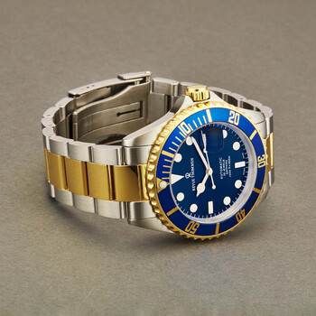 Stainless steel case with a two-tone (silver-tone and yellow gold-tone) stainless steel bracelet. Unidirectional rotating yellow gold-tone bezel with a blue metallic ring. Blue dial with luminous yellow gold-tone hands and dot hour markers. Minute markers around the outer rim. Dial Type: Analog. Luminescent hands and markers. Date display at the 3 o'clock position. Automatic movement with a 38-hour power reserve. Scratch resistant sapphire crystal. Screw down crown. Stainless steel case back. Round case shape. Case size: 42 mm. Case thickness: 13 mm. Band width: 22 mm. Band length: 8 inches. Fold over clasp with a safety release. Water resistant at 300 meters / 1000 feet. Functions: date, hour, minute, second. Diver Xl Series. Casual watch style. Watch label: Swiss Made. Revue Thommen Diver XL Automatic Blue Dial Men's Watch 17571.2145.