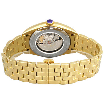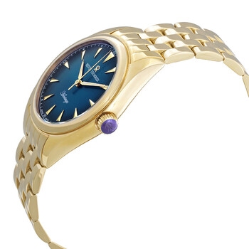 Yellow gold-tone stainless steel case and bracelet. Fixed yellow gold-tone stainless steel bezel. Blue dial with yellow gold-tone hands and index hour markers. Minute markers around the outer rim. Dial Type: Analog. Luminescent hands and markers. Automatic movement. Scratch resistant sapphire crystal. Pull / push crown. Transparent see through case back. Round case shape, case size: 39 mm, case thickness: 10 mm. Band width: 20 mm, band length: 8 inches. Deployment with push button release clasp. Water resistant at 50 meters / 165 feet. Functions: hour, minute, second. Heritage Series. Luxury watch style. Watch label: Swiss Made. Revue Thommen Heritage Automatic Blue Dial Men's Watch 21010.2115.