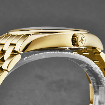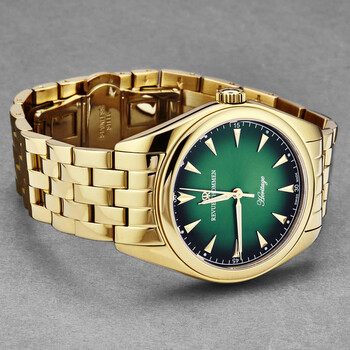 Yellow gold-tone stainless steel case and bracelet. Fixed yellow gold-tone bezel. Green dial with yellow gold-tone hands and index hour markers. Minute markers around the outer rim. Dial Type: Analog. Luminescent hands and markers. Automatic movement. Scratch resistant sapphire crystal. Pull / push crown. Transparent see through case back. Round case shape. Case size: 39 mm. Case thickness: 10 mm. Band width: 20 mm. Band length: 8 inches. Deployment clasp with a push button release. Water resistant at 50 meters / 165 feet. Functions: hour, minute, second. Heritage Series. Luxury watch style. Watch label: Swiss Made. Revue Thommen Heritage Automatic Green Dial Men's Watch 21010.2114.