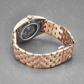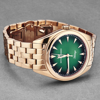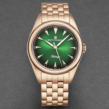 Rose gold-tone stainless steel case and bracelet. Fixed rose gold-tone bezel. Green dial with luminous rose gold-tone hands and index hour markers. Minute markers around the outer rim. Dial Type: Analog. Luminescent hands and markers. Automatic movement. Scratch resistant sapphire crystal. Pull / push crown. Transparentcase back. Round case shape. Case size: 39 mm. Case thickness: 10 mm. Band width: 20 mm. Band length: 8 inches. Deployment clasp with a push button release. Water resistant at 50 meters / 165 feet. Functions: hour, minute, second. Heritage Series. Luxury watch style. Watch label: Swiss Made. Revue Thommen Heritage Automatic Green Dial Men's Watch 21010.2164.
