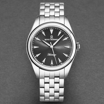 Stainless steel case with a stainless steel bracelet. Fixed stainless steel bezel. Grey dial with luminous silver-tone hands and index hour markers. Minute markers around the outer rim. Dial Type: Analog. Luminescent hands and markers. Automatic movement with a 38-hour power reserve. Scratch resistant sapphire crystal. Pull / push crown. Transparent case back. Round case shape. Case size: 39 mm. Case thickness: 10 mm. Band width: 18 mm, band length: 8 inches. Deployment clasp with a push button release. Water resistant at 50 meters / 165 feet. Functions: hour, minute, second. Heritage Series. Luxury watch style. Watch label: Swiss Made. Revue Thommen Heritage Automatic Grey Dial Men's Watch 21010.2122.