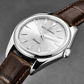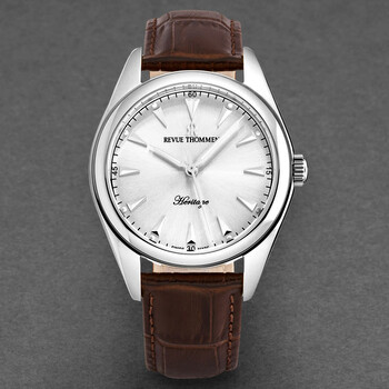 Stainless steel case with a brown leather strap. Fixed stainless steel bezel. Silver dial with luminous silver-tone hands and index hour markers. Minute markers around the outer rim. Dial Type: Analog. Luminescent hands and markers. Automatic movement. Scratch resistant sapphire crystal. Pull / push crown. Transparent case back. Round case shape. Case size: 39 mm. Case thickness: 10 mm. Band width: 18 mm. Band length: 8 inches. Tang clasp. Water resistant at 50 meters / 165 feet. Functions: hour, minute, second. Heritage Series. Luxury watch style. Watch label: Swiss Made. Revue Thommen Heritage Automatic Silver Dial Men's Watch 21010.2533.