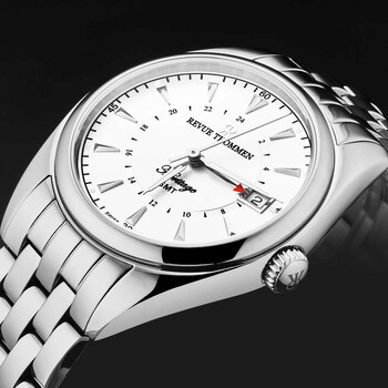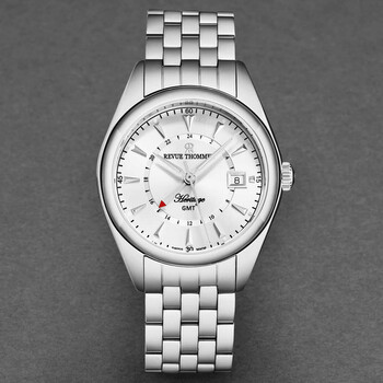 Silver-tone stainless steel case and bracelet. Fixed silver-tone stainless steel bezel. Silver-tone dial with silver-tone hands and index hour markers. Minute markers around the outer rim. Dial Type: Analog. Luminescent hands and markers. Date display at the 3 o'clock position. Sellita Caliber SW330-1 Automatic movement, containing 25 Jewels, bitting at 28800 vph, and has a power reserve of approximately 42 hours. Scratch resistant sapphire crystal. Pull / push crown. Transparent case back. Round case shape, case size: 41 mm, case thickness: 12 mm. Band width: 20 mm, band length: 8 inches. Deployment with push button release clasp. Water resistant at 50 meters / 165 feet. Functions: date, GMT, second time zone, hour, minute, second. Additional Info: hours, minutes, seconds, date, GMT. Heritage Series. Luxury watch style. Watch label: Swiss Made. Revue Thommen Heritage Automatic Silver Dial Men's Watch 21010.2332.