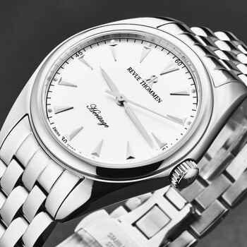 Stainless steel case with a stainless steel bracelet. Fixed stainless steel bezel. Silver-tone dial with luminous silver-tone hands and index hour markers. Minute markers around the outer rim. Dial Type: Analog. Luminescent hands and markers. Automatic movement. Scratch resistant sapphire crystal. Pull / push crown. Transparent case back. Round case shape. Case size: 39 mm. Case thickness: 10 mm. Band width: 18 mm. Band length: 8 inches. Deployment clasp with a push button release. Water resistant at 50 meters / 165 feet. Functions: hour, minute, second. Heritage Series. Luxury watch style. Watch label: Swiss Made. Revue Thommen Heritage Automatic Silver Dial Men's Watch 21010.2133.