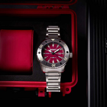 Silver-tone stainless steel case and bracelet. Silver-tone stainless steel bezel. Red dial with luminous hands and index hour markers. Dial Type: Analog. Luminescent hands and markers. Date display at the 3 o'clock position. Automatic movement. Scratch resistant sapphire crystal. Round case shape, case size: 54 mm, case thickness: 18 mm. Band width: 26 mm. Fold over clasp with a safety release. Water resistant at 100 meters / 330 feet. Functions: date, hour, minute, second. All-brite Series. Sport watch style. Watch label: Japan Movt. RGMT All-Brite Automatic Red Dial Men's Watch RG-8056-33. Silver-tone stainless steel case and bracelet. Fixed silver-tone stainless steel bezel. Red dial with black hands and index hour markers. Minute markers around the outer rim. Dial Type: Analog. Luminescent hands and markers. Date display at the 3 o'clock position. Miyota Caliber 8215 Automatic movement, containing 21 Jewels, bitting at 21600 vph, and has a power reserve of approximately 42 hours. Scratch resistant sapphire crystal. Screw down crown. Solid case back. Round case shape, case size: 54 mm, case thickness: 18 mm. Band width: 26 mm, band length: 8 inches. Fold over clasp with a safety release. Water resistant at 1000 meters / 3300 feet. Functions: date, hour, minute, second. All-brite Series. Dive watch style. Watch label: Japan Movt. RGMT All-Brite Red Dial Men's Watch RG-8056-33.