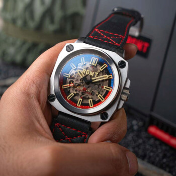 Straight from the onboard instrumentation of an airborne cockpit, the Altimeter is a standout piece in the RGMT range. Strong, uncompromising in design it is an unmistakable example of the best of our watchmaking put to the test. This new iteration is powered by Seiko NH70 skeletonized automatic movement, ensuring a reliable and stylish timekeeping experience. Silver-tone stainless steel case with a black leather strap. Fixed silver-tone stainless steel bezel. Black dial with black hands and Arabic numeral & index hour markers. Minute markers around the outer rim. Dial Type: Analog. Luminescent hands and markers. Seiko - NH70 automatic movement. Scratch resistant sapphire crystal. Screw down crown. Solid case back. Square case shape, case size: 46 mm, case thickness: 13 mm. Band width: 22 mm, band length: 8 inches. Buckle clasp. Water resistant at 100 meters / 330 feet. Functions: hour, minute, second. Altimeter Series. Casual watch style. RGMT Altimeter Black Dial Men's Watch RG-8064-02.