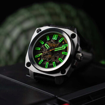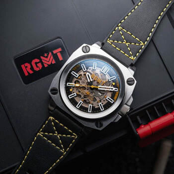 Straight from the onboard instrumentation of an airborne cockpit, the Altimeter is a standout piece in the RGMT range. Strong, uncompromising in design it is an unmistakable example of the best of our watchmaking put to the test. This new iteration is powered by Seiko NH70 skeletonized automatic movement, ensuring a reliable and stylish timekeeping experience. Silver-tone stainless steel case with a black leather strap. Fixed silver-tone stainless steel bezel. Black dial with black hands and index hour markers. Minute markers around the outer rim. Dial Type: Analog. Luminescent hands and markers. Seiko - NH70 automatic movement. Scratch resistant sapphire crystal. Screw down crown. Solid case back. Square case shape, case size: 46 mm, case thickness: 13 mm. Band width: 22 mm, band length: 8 inches. Buckle clasp. Water resistant at 100 meters / 330 feet. Functions: hour, minute, second. Altimeter Series. Casual watch style. RGMT Altimeter Black Dial Men's Watch RG-8064-03.