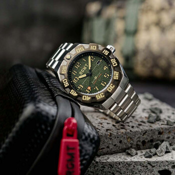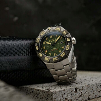 At a glance, the Field Master is an capable all-rounder utility timepiece.Its design is inspired by principally developing a watch that is utterly robust, clear to read at an instant, durable and dependable.A precision Seiko TMI NH35 affords the watch a battery-free functionality that makes it the perfect timepiece for adventure on land, sea, or any environment.Uni-Directional bezel is designed to give the wearer a better grip allowing for turn functionality even while wearing gloves or other tactical equipment.A strong angular design of the case is deliberately chosen to give the watch a tank-like stability and robust quality for wear sure to endure.100m Water Resistant, Crafted out of Solid Stainless Steel with Ionic Black Titanium Carbide Plating, for a stealthy finish and look, with liberally dipped luminous dial and hands - and powered by a workhorse Nh35 Automatic Movement. Silver-tone stainless steel case and bracelet. Bi-directional rotating green stainless steel bezel. Green dial with black hands and Arabic numeral & index hour markers. Minute markers around the outer rim. Dial Type: Analog. Luminescent hands and markers. Date display at the 3 o'clock position. Seiko - NH35 automatic movement. Scratch resistant sapphire crystal. Screw down crown. Solid case back. Round case shape, case size: 46 mm, case thickness: 15 mm. Band width: 24 mm, band length: 8 inches. Fold over clasp. Water resistant at 100 meters / 330 feet. Functions: date, hour, minute, second. Field Master Series. Casual watch style. RGMT Field Master Green Dial Men's Watch RG-8032-CC.