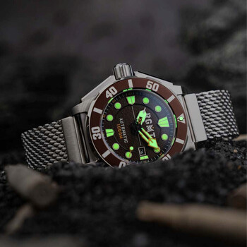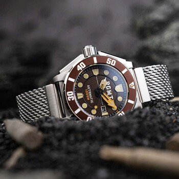 The Torpedo aims for performance. The case is marketd by its vertically aligned, automatically regulated helium release valve. Shaped and formed for deep dive performance the Torpedo is capable of 1000m of water resistance to serve in any condition on land or at speed beneath the waves. Silver-tone stainless steel case and bracelet. Bi-directional rotating brown stainless steel bezel. Brown dial with silver-tone hands and Arabic numeral & index hour markers. Minute markers around the outer rim. Dial Type: Analog. Luminescent hands and markers. Date display at the 3 o'clock position. Seiko - NH35 automatic movement. Scratch resistant sapphire crystal. Screw down crown. Solid case back. Round case shape, case size: 51 mm, case thickness: 16 mm. Band width: 22 mm, band length: 8 inches. Fold over clasp. Water resistant at 1000 meters / 3300 feet. Functions: date, hour, minute, second. Torpedo Series. Dive watch style. RGMT Torpedo Brown Dial Men's Watch RG-8027-88.