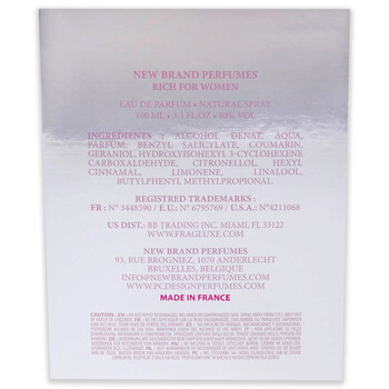 Rich by New Brand is more than just a perfume, it's a luxurious experience. The scent name, Rich, perfectly encapsulates the lush and indulgent nature of this fragrance. This perfume is carefully housed in a 3.3 oz EDP spray bottle, ensuring the perfect amount of scent with each spritz.