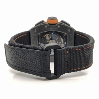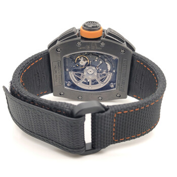 Black titanium case with a black velcro band. Fixed black titanium bezel. Black dial with silver-tone hands and Arabic numeral hour markers. Minute markers around the outer rim. Dial Type: Analog. Luminescent hands. Date display at the 12 o'clock position. Chronograph - three sub-dials displaying: 60 second, 60 minute and 12 hour/60 minute. Richard Mille Calibre RMAC1 automatic movement with a 50-hour power reserve. Scratch resistant sapphire crystal. Screw down crown. Transparent case back. Tonneau case shape. Case size: 40 mm. Deployment clasp. Water resistant at 50 meters / 165 feet. Functions: chronograph, flyback, big date, second time zone, hour, minute, second. Additional Info: unworn, 2015, comes with box & papers. Sport watch style. Watch label: Swiss Made. Richard Mille Felipe Massa Americas Automatic Black Dial Unisex Watch RM011.