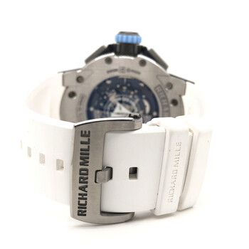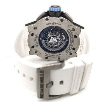 Gray titanium case with a white rubber strap. Bi-directional rotating gray titanium bezel. Transparent dial with silver-tone hands and index hour markers. Minute markers around the outer rim. Dial Type: Analog. Luminescent hands and markers. Date display at the 12 o'clock position. Richard Mille Calibre RMAC2 automatic movement with a 50-hour power reserve. Scratch resistant sapphire crystal. Screw down crown. Transparent case back. Round case shape, case size: 50 mm, case thickness: 16.33 mm. Buckle clasp. Water resistant at 100 meters / 330 feet. Functions: hours, minutes, running seconds, oversize date, month, annual calendar, flyback chronograph with central seconds, 30-minute countdown timer, 24-hour totalizer, utc function. Luxury watch style. Richard Mille Les Voiles de St Barth Chronograph Automatic Men's Watch RM 60-01 St Barth.