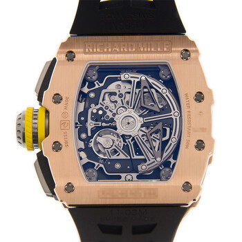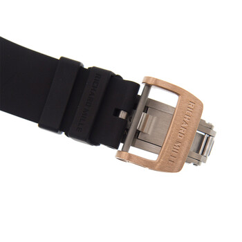 Rose gold-tone 18kt rose gold case with a black rubber strap. Fixed rose gold-tone 18kt rose gold bezel. Transparent dial with rose gold-tone hands and Arabic numeral hour markers. Minute markers around the outer rim. Dial Type: Analog. Luminescent hands and markers. Date display between 4 and 5 o'clock position. Chronograph - three sub-dials displaying: 60 second, 30 minute and 12 hour. Richard Mille Calibre RMAC3 automatic movement with a 55-hour power reserve. Scratch resistant sapphire crystal. Screw down crown. Transparent case back. Tonneau case shape, case size: 49 mm, case thickness: 9 mm. Water resistant at 50 meters / 165 feet. Functions: chronograph, flyback, big date, hour, minute, second, shock resistant. Luxury watch style. Watch label: Swiss Made. Richard Mille Richard Mille 11-03 Chronograph Automatic Men's Watch 11-03 RGTI.