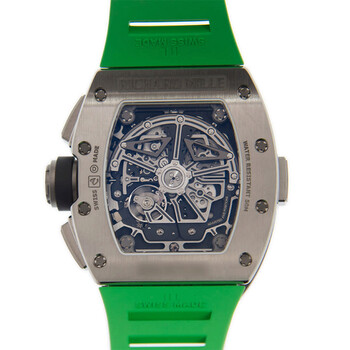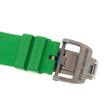 Grey titanium case with a green rubber strap. Fixed grey titanium bezel. Transparent dial with silver-tone hands and Arabic numeral hour markers. Tachymeter scale around the outer rim. Dial Type: Analog. Luminescent hands and markers. Date display at the 12 o'clock position, month display between 4 and 5 o'clock. Chronograph - three sub-dials displaying: 60 second, 60 minute and 12 hour/60 minute. Richard Mille Calibre RMAC1 Automatic movement, containing 62 Jewels, bitting at 28800 vph, and has a power reserve of approximately 50 hours. Scratch resistant sapphire crystal. Transparent case back. Tonneau case shape, case size: 42.7 mm. Deployment clasp. Water resistant at 50 meters / 165 feet. Functions: chronograph, flyback, big date, second time zone, hour, minute, second. Additional Info: original box, international warranty card, manual (complete accessories). Rm 11-02 Series. Luxury watch style. Watch label: Swiss Made. Richard Mille RM 11-02 Flyback Chronograph Dual Time Zone Automatic Titanium Men's Watch RM11-02 TI.