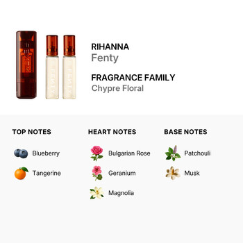 Fenty opens with a playful burst of juicy blueberry and sweet tangerine, creating an energizing and fresh introduction. As the scent unfolds, delicate heart notes of Bulgarian rose, geranium, and magnolia bloom beautifully, adding a touch of romance and femininity. The fragrance finishes with warm base notes of patchouli and musk, grounding the scent in a rich, sensual finish that lingers throughout the day.