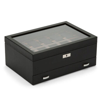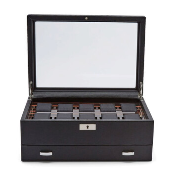 Inspired by the best of British motorcars, Jaguar, Aston Martin, Bristol and the like. Roadster 10 piece watch box wrapped in leather with details of ebony macassar polished wood.