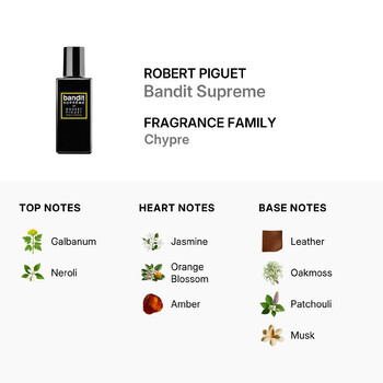 As the fragrance settles, the robust base notes of Leather, Oakmoss, Patchouli, and Musk unfold. These earthy tones bring a sense of depth and complexity to the fragrance, giving it a long-lasting and memorable finish. The Bandit Supreme EDP Spray is a testament to Robert Piguet's expertise in creating fragrances that are timeless, elegant, and supremely irresistible.