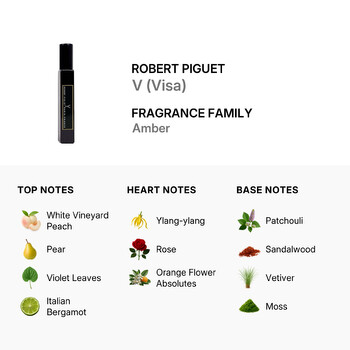 V opens with a splash of exotic sweetness. The rich floral notes of ylang-ylang effortlessly mingle with juicy pear and sparkling bergamot, creating a bright and inviting introduction. As the fragrance evolves, a luxurious heart of romantic rose, velvety white peach, and a whisper of cinnamon adds warmth and depth, revealing the scent’s sultry essence.