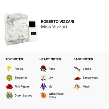 Step into a world of elegance and charm with Miss Vizzari by Roberto Vizzari. Launched in 2013, this captivating Eau de Parfum is a signature fragrance crafted especially for ladies who embrace grace and confidence. Miss Vizzari opens with a refreshing burst of reesia, bergamot, pink pepper, and green leaves, creating a vibrant and lively first impression.