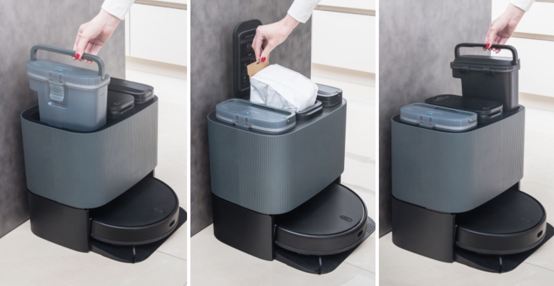 რობოტი მტვერსასრუტის 3 მოცულობითი კონტეინერები შექმნილია მეტი კომფორტისთვის. მოწყობილობას აქვს 3 კონტეინერი, მტვრის, სუფთა წყლის და დაბინძურებული წყლისთვის, რომელთა გასუფთავება და დაცლა არის მარტივი. მოწყობილობა სამუშაოს დასრულებისთანავე უბრუნდება დოკს. მტვერსასრუტი არ ტოვებს წყლის კვალს იატაკზე, ის ბოლომდე ასუფთავებს მას, თავისი დამატებითი საცმის მეშვეობით. მტვერსასრუტის მტვრის კონტეინერის ტომრის დაცლა რეკომენდირებულია კვირაში ერთხელ. მტვერსასრუტი ყოველი 8,10,12 მ2-ის წმენდის შემდეგ (აპლიკაციაში რეგულირებადი) უბრუნდება დოკს, ასუფთავებს ჭუჭყიან საფენებს და იწოვს წყალს ჭუჭყიანი წყლის კონტეინერში, შემდეგ ხელახლა ასველებს mops სუფთა წყლით და აგრძელებს მუშაობას.