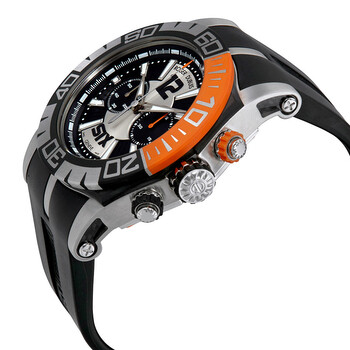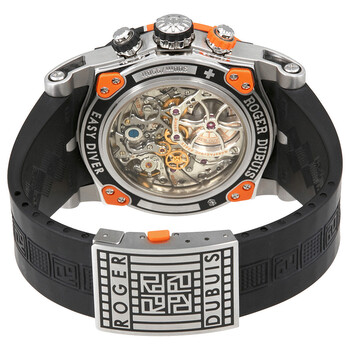 Silver-tone stainless steel case with a black rubber strap. Uni-directional rotating bezel. Black and silver dial with black hands and index-Arabic numerals hour markers. Minute markers around the outer rim. Dial Type: Analog. Luminescent hands and markers. Chronograph - two sub-dials displaying: 60 second and 45 minute. Roger Dubuis Calibre RD78 automatic movement with a 42-hour power reserve. Scratch resistant sapphire crystal. Screw down crown. Transparent case back. Case size: 46 mm. Case thickness: 15 mm. Round case shape. Water resistant at 300 meters / 1000 feet. Functions: chronograph, hour, minute, second. Additional Info: limited edition of 280 pieces. Dive watch style. Watch label: Swiss Made. Roger Dubuis Easy Diver Chronograph Automatic Men's Limited Edition Watch RDDBSE0254.