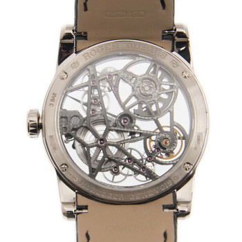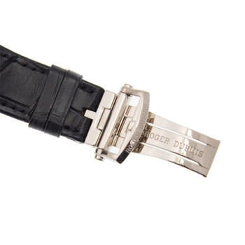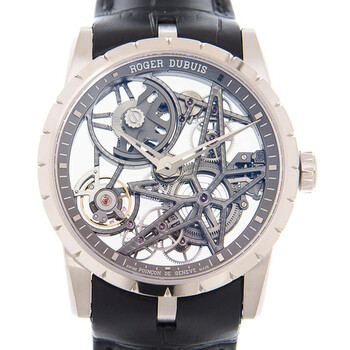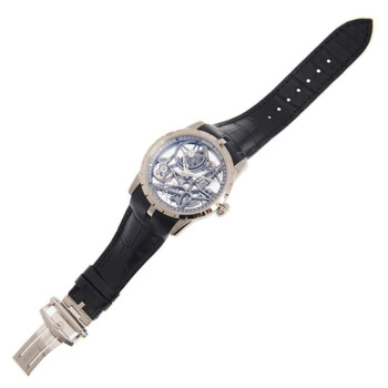Silver-tone stainless steel case with a black alligator band. Fixed silver-tone stainless steel bezel. Transparent dial with silver-tone hands and index hour markers. Minute markers around the outer rim. Dial Type: Analog. Automatic movement. Scratch resistant sapphire crystal. Transparent see through case back. Round case shape, case size: 42 mm. Deployment with push button release clasp. Water resistant at 30 meters / 100 feet. Functions: hour, minute, second. Additional Info: original box, international warranty card, manual (complete accessories). Exalibur Series. Luxury watch style. Watch label: Swiss Made. Roger Dubuis Exalibur Automatic Men's Watch DBEX0507.