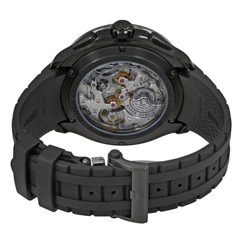 Black dlc titanium case with a black rubber strap. Black bezel. Skeleton dial with silver-tone hands and index hour markers. Tachymeter. Dial Type: Analog. Chronograph - two sub-dials displaying: 60 second, 30 minute. Roger Dubuis Calibre RD680 automatic movement with a 52-hour power reserve. Scratch resistant sapphire crystal. Transparent case back. Case size: 44 mm. Round case shape. Water resistant at 100 meters / 330 feet. Functions: chronograph, hour, minute, second. Luxury watch style. Watch label: Swiss Made. Roger Dubuis Pulsion Automatic Men's Chronograph Watch RDDBPU0005.