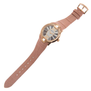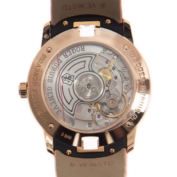 Rose gold-tone 18kt rose gold case with a pink alligator leather strap. Fixed rose gold-tone bezel with diamond set 18kt rose gold. White dial with gold-tone hands and Roman numeral hour markers. Dial Type: Analog. One subdial displaying: small second. Roger Dubuis Calibre RD821 Automatic movement, containing 33 Jewels, composed of 172 parts, bitting at 28800 vph, and has a power reserve of approximately 48 hours. Scratch resistant sapphire crystal. Transparent see through case back. Round case shape, case size: 36 mm. Buckle clasp. Water resistant at 30 meters / 100 feet. Functions: hour, minute. Additional Info: original box, international warranty card, manual (complete accessories). Velvet Series. Luxury watch style. Watch label: Swiss Made. Roger Dubuis Velvet Automatic Diamond White Dial Ladies Watch RDDBVE0033.