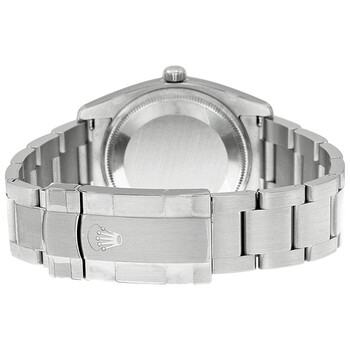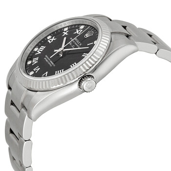 Stainless steel case with a stainless steel rolex oyster bracelet. Fixed - fluted 18k white gold bezel. Black dial with silver-tone hands and Roman numeral and diamond hour markers. Minute markers around the outer rim. Dial Type: Analog. Automatic movement. Scratch resistant sapphire crystal. Screw down crown. Case diameter: 34 mm. Round case shape. Hidden deployment clasp. Water resistant at 100 meters / 330 feet. Functions: hour, minute, second. Luxury watch style. Watch label: Swiss Made. Rolex Air King Black Dial Stainless Steel Rolex Oyster Automatic Men's Watch 114234BKRDO.