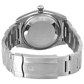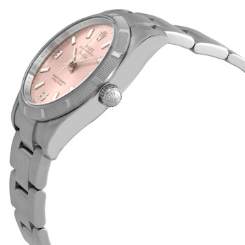 Stainless steel case with a stainless steel oyster bracelet. Fixed engine turned stainless steel bezel. Pink dial with luminous hands and luminous index hour markers. Arabic numerals appear at the 3, 6 and 9 o'clock positions. Minute markers around the outer rim. Luminescent hands and dial markers. Rolex calibre 3130 automatic movement with a 48-hour power reserve. Scratch resistant sapphire crystal. Case diameter: 34 mm. Deployment clasp. Water resistant at 100 meters/ 330 feet. Rolex Airking Pink Arabic and Index Dial Engine Turned Bezel Men's Watch 114210PASO.