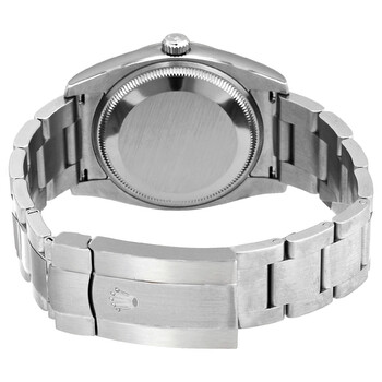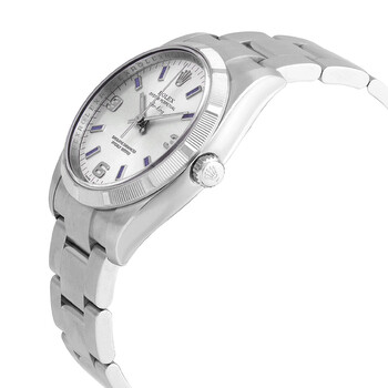 Stainless steel case with a stainless steel oyster bracelet. Engine-turned stainless steel bezel. Silver dial with luminous hands and index hour markers. Arabic numerals appear at the 3, 6 and 9 o'clock positions. Minute markers around the outer rim. Dial Type: Analog. Luminescent hands and dial markers. Rolex calibre 3130 automatic movement, containing 31 Jewels, bitting at 28800 vph, and has a power reserve of approximately 48 hours. Scratch resistant sapphire crystal. Screw down crown. Solid case back. Round case shape. Case size: 34 mm. Deployment clasp. Water resistant at 100 meters / 330 feet. Functions: hour, minute, second, chronometer. Air-king Series. Luxury watch style. Watch label: Swiss Made. Item Variations: 114210, 114210-SABLSO, Rolex-114210, Rolex-114210-SABLSO. Rolex Airking Silver Arabic Blue Index Engine Turned Bezel Men's Watch 114210SABLSO.