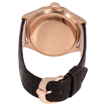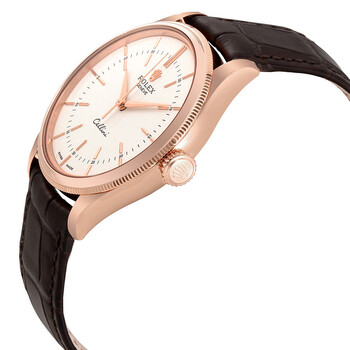 Rose gold-tone 18kt everose gold case with a brown leather strap. Fixed domed and fluted rose gold-tone 18kt everose gold bezel. White lacquer dial with rose goldtone alpha-style shape hands and index hour markers. Minute markers. Dial Type: Analog. Rolex Calibre 3132 Automatic movement, based upon Rolex 3130, containing 31 Jewels, bitting at 28800 vph, and has a power reserve of approximately 48 hours. Scratch resistant sapphire crystal. Screw down crown. Solid case back. Round case shape. Case size: 39 mm. Tang clasp. Water resistant at 100 meters / 330 feet. Functions: hour, minute, second, chronometer. Luxury watch style. Watch label: Swiss Made. Item Variations: 50505-STRAP. Rolex Cellini Automatic White Lacquer Dial Brown (Tobacco) Leather Watch 50505WSL.