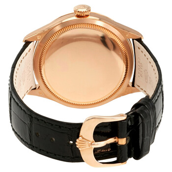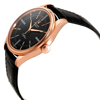 Rose gold-tone 18kt everose gold case with a black crocodile leather strap. Fixed domed and fluted rose gold-tone 18kt everose gold bezel. Black dial with 18kt everose gold hands and index hour markers. Roman numeral at the 3, 6, 9 and 12 o'clock positions. minute markers around an inner ring. Dial Type: Analog. Rolex Calibre 3132 automatic movement with a 48-hour power reserve. Scratch resistant sapphire crystal. Screw down crown. Solid case back. Round case shape. Case size: 39 mm. Tang clasp. Water resistant at 50 meters / 165 feet. Functions: hour, minute, second, chronometer. Luxury watch style. Watch label: Swiss Made. Rolex Cellini Black Dial 18K Rose Gold Automatic Men's Watch 50505BKSRL.