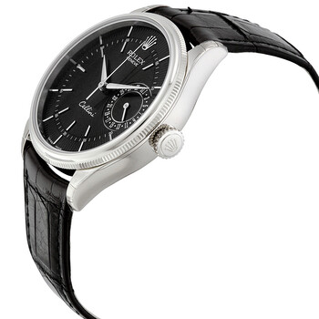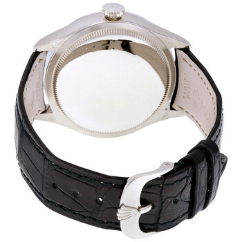 18kt white gold case with a black alligator leather strap. Fixed domed and fluted 18kt white gold bezel. Black dial with white gold alpha-style shape hands and index hour markers. Minute markers. Dial Type: Analog. Date display at the 3 o'clock position. One subdial displaying: date. Rolex Calibre 3165 Automatic movement, based upon Rolex 3130, containing 31 Jewels, bitting at 28800 vph, and has a power reserve of approximately 48 hours. Scratch resistant sapphire crystal. Screw down crown. Solid case back. Round case shape, case size: 39 mm. Buckle clasp. Water resistant at 50 meters / 165 feet. Functions: date, hour, minute, second, chronometer. Cellini Series. Luxury watch style. Watch label: Swiss Made. Item Variations: 50519-STRAP. Rolex Cellini Date Black Dial 18kt White Gold Men's Watch 50519BKSBKL.