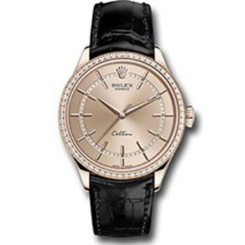 18kt everose gold case with a black alligator band. Fixed diamond set bezel. Champagne dial with index hour markers. Minute markers around an inner ring. Dial Type: Analog. Rolex Calibre 3132 automatic movement with a 48-hour power reserve. Scratch resistant domed sapphire crystal crystal. Screw down crown. Solid case back. Round case shape. Case size: 39 mm. Tang clasp. Water resistant at 50 meters / 165 feet. Functions: hour, minute, second. Luxury watch style. Watch label: Swiss Made. Rolex Cellini Automatic Diamond Champagne Dial Men's Watch 50705.