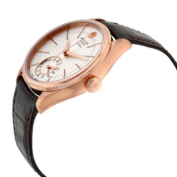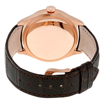 Rose gold-tone 18kt everose gold case with a brown alligator leather strap. Fixed domed and fluted rose gold-tone 18kt everose gold bezel. Silver dial with rose gold-tone hands and index hour markers. Minute markers around the outer rim. Dial Type: Analog. One subdial displaying: 12 hour with day/night indicator. Rolex Calibre 3180 Automatic movement, based upon Rolex 3130, containing 31 Jewels, bitting at 28800 vph, and has a power reserve of approximately 48 hours. Scratch resistant sapphire crystal. Screw down crown. Solid case back. Round case shape, case size: 39 mm. Tang clasp. Water resistant at 50 meters / 165 feet. Functions: GMT, second time zone, hour, minute, second, day/night indicator, chronometer. Cellini Series. Luxury watch style. Watch label: Swiss Made. Item Variations: 50525-STRAP. Rolex Cellini Dual Time Silver Dial 18kt Everose Gold Men's Watch 50525SSBRL.