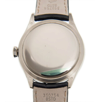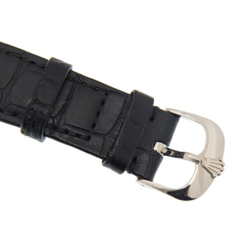 18kt white gold case with a black alligator leather strap. Fixed bezel with diamond set. Black dial with diamond-tipped index hour markers. Minute markers around an inner ring. Dial Type: Analog. Rolex Calibre 3132 Automatic movement, based upon Rolex 3130, containing 31 Jewels, bitting at 28800 vph, and has a power reserve of approximately 48 hours. Scratch resistant domed sapphire crystal crystal. Screw down crown. Solid case back. Round case shape, case size: 39 mm. Tang clasp. Water resistant at 50 meters / 165 feet. Functions: hour, minute, second. Cellini Time Series. Luxury watch style. Watch label: Swiss Made. Rolex Cellini Time Automatic Diamond Black Dial Ladies Watch 50709BKDBKL.