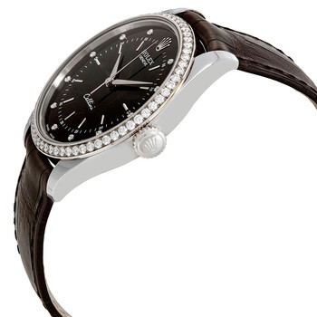 18kt white gold case with a brown alligator leather strap. Fixed 18kt everose gold bezel with diamond set. Black dial with white gold alpha-style shape hands and diamond-tipped index hour markers. Minute markers around an inner ring. Dial Type: Analog. Rolex Calibre 3132 Automatic movement, based upon Rolex 3130, containing 31 Jewels, bitting at 28800 vph, and has a power reserve of approximately 48 hours. Scratch resistant domed sapphire crystal crystal. Screw down crown. Solid case back. Round case shape, case size: 39 mm. Tang clasp. Water resistant at 50 meters / 165 feet. Functions: hour, minute, second. Cellini Time Series. Luxury watch style. Watch label: Swiss Made. Rolex Cellini Time Black Diamond Dial Ladies Alligator Leather Watch 50709BKDL.
