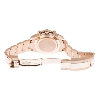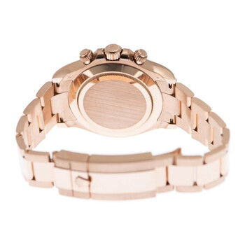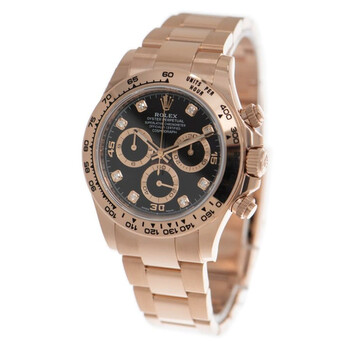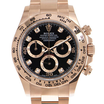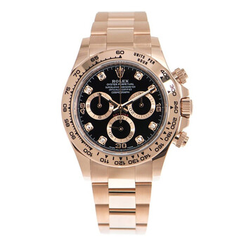 18kt everose gold case with a 18kt everose gold oyster bracelet. Fixed 18kt everose gold bezel showing tachymeter markings. Black dial with luminous 18kt everose gold hands and diamond hour markers. Minute markers around the outer rim. Dial Type: Analog. Luminescent hands. Chronograph - three sub-dials displaying: 12 hours, 30 minutes and 60 seconds. Rolex calibre 4130 automatic movement, based upon Rolex 4030, containing 44 Jewels, bitting at 28800 vph, and has a power reserve of approximately 72 hours. Scratch resistant sapphire crystal. Screw down crown. Screw down case back. Round case shape. Case size: 40 mm. Fold over clasp (with 5 mm comfort extension link). Water resistant at 100 meters / 330 feet. Functions: chronograph, hour, minute, second, chronometer. Cosmograph Daytona Series. Luxury watch style. Watch label: Swiss Made. Rolex Cosmograph Daytona Automatic Diamond Black Dial Watch 116505BKDO.