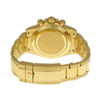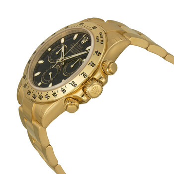 18k yellow gold case with a 18k yellow gold rolex oyster bracelet. Fixed - 18k yellow gold (tachymeter engraved) bezel. Black dial with yellow gold-tone hands and index hour markers. Minute markers around the outer rim. Dial Type: Analog. Luminescent hands and dial markers. Chronograph - three sub-dials displaying: 60 second, 30 minute and 12 hour. Automatic movement. Scratch resistant sapphire crystal. Case diameter: 40 mm. Round case shape. Oyster clasp. Water resistant at 100 meters / 330 feet. Functions: chronograph, hour, minute, second. Luxury watch style. Watch label: Swiss Made. Rolex Cosmograph Daytona Black Dial 18K Yellow Gold Rolex Oyster Automatic Men's Watch 116528BKSO.