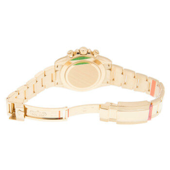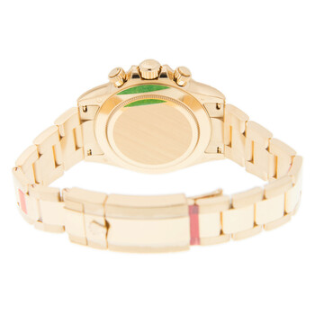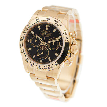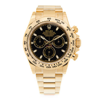18kt yellow gold case with a 18kt yellow gold rolex oyster bracelet. Fixed yellow gold 18kt yellow gold bezel. Black dial with gold-tone hands and index hour markers. Tachymeter. Dial Type: Analog. Luminescent hands and markers. Chronograph - three sub-dials displaying: 60 second, 30 minute and 12 hours. Rolex Calibre 4130 automatic movement with a 72-hour power reserve. Scratch resistant sapphire crystal. Screw down crown. Solid case back. Case size: 40 mm. Round case shape. Water resistant at 100 meters / 330 feet. Functions: chronograph, hour, minute, second. Luxury watch style. Watch label: Swiss Made. Rolex Cosmograph Daytona Black Dial Automatic Men's Chronograph Watch 116508BKSO.